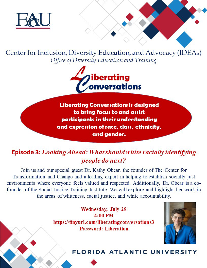 Join us and our special guest Dr. Kathy Obear, the founder of The Center for Transformation and Change and a leading expert in helping to establish socially just environments where everyone feels valued and respected. Additionally, Dr. Obear is a co-founder of the Social Justice Training Institute. We will explore and highlight her work in the areas of whiteness, racial justice, and white accountability.
