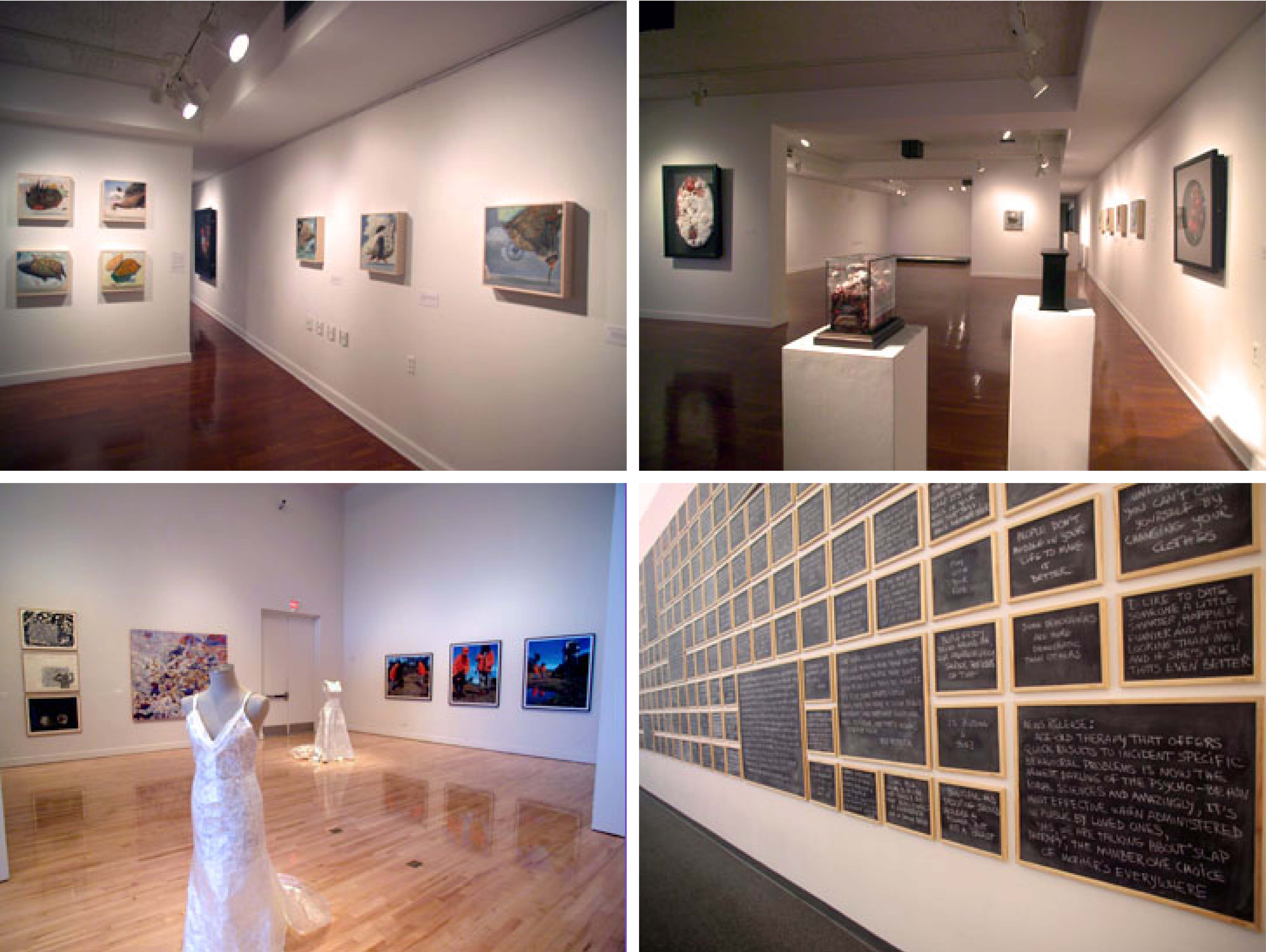 (clockwise from top left): Two installation views of the Ritter Art Gallery; installation view of the Schmidt Center Gallery Public Space; installation view of the Schmidt Center Gallery.