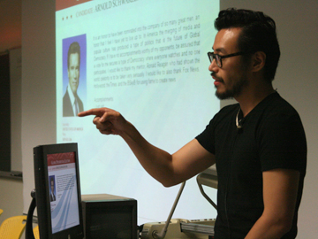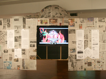 (clockwise from top left): Installation view of Kenneth Tin-Kin Hung's 'Election Erection' (Mordes Collection); Jane Caputi lecturing at opening synposium; Installation view of Ring #2 and #3; Kenneth Tin-Kin Hung speaking during opening.