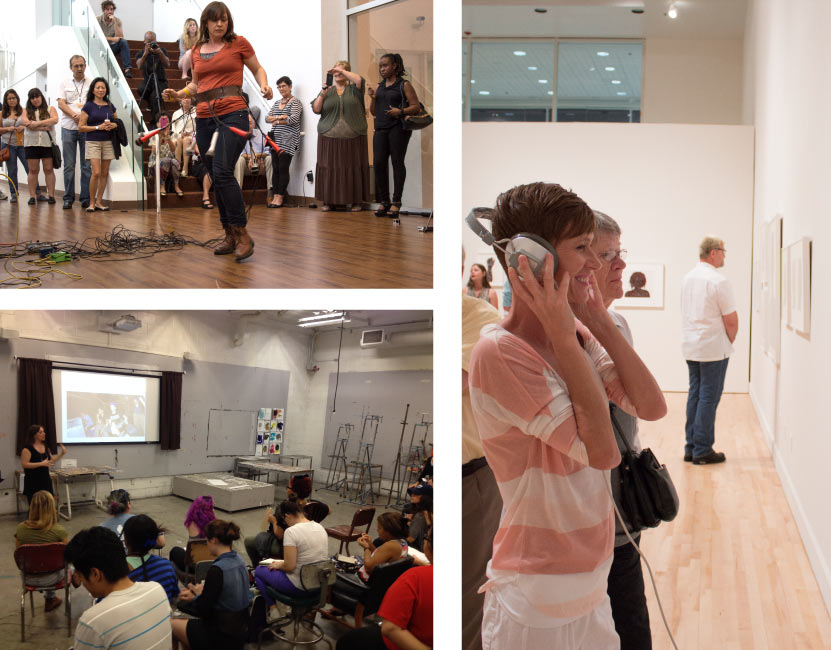 (bottom left) Valerie George presenting public lecture. (right) Visitors listening to the installation, Split Series in the Schmidt Center Gallery.