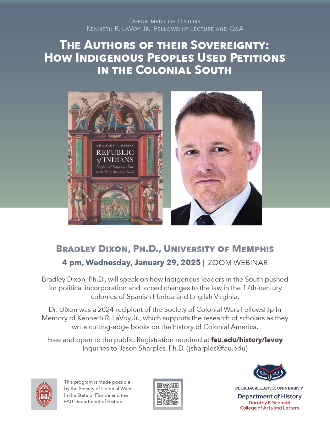This program is made possible by the Society of Colonial Wars in the State of Florida through the Society of Colonial Wars Fellowship in Memory of Kenneth R. LaVoy Jr., the FAU Libraries, and the Department of History.