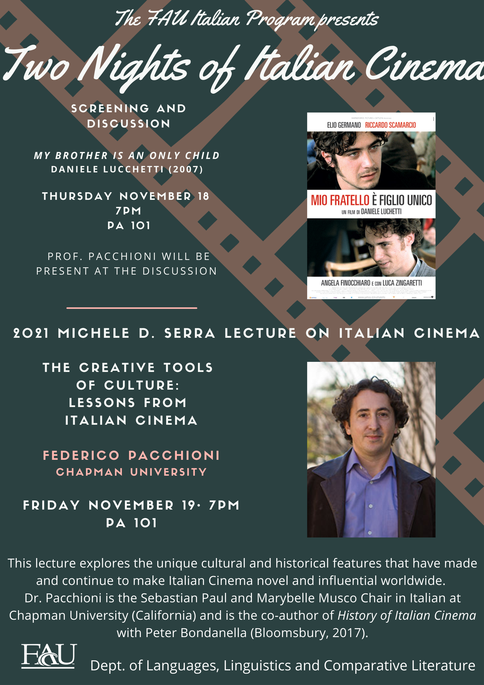 Federico Pacchioni, Sebastian Paul and Marybelle Musco Chair in Italian at Chaptman University (California) delivered the 2021 Michele Serra Lecture in Italian Cinema. Film students and Italian Studies students utilize the textbook that he co-authored with Peter Bondanella, A History of Italian Cinema (Bloomsbury Press 2017).