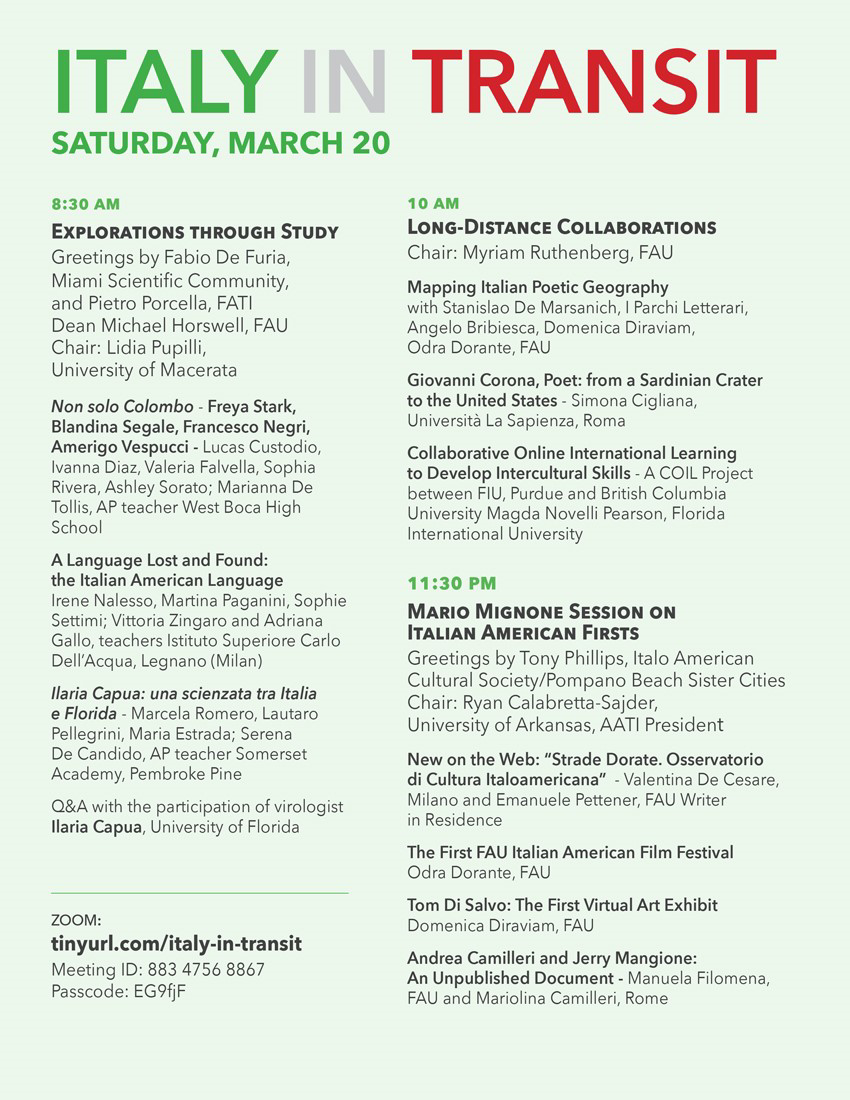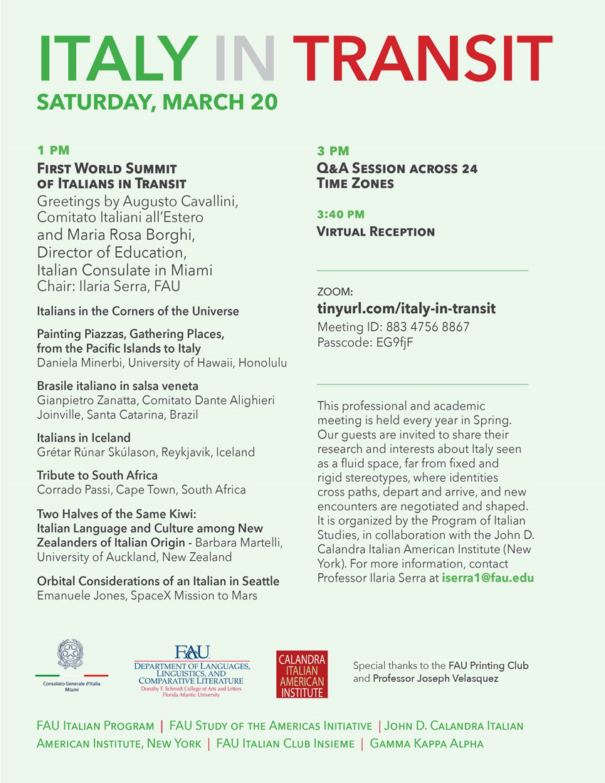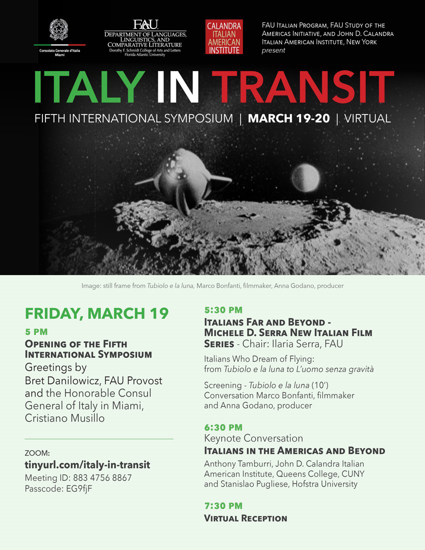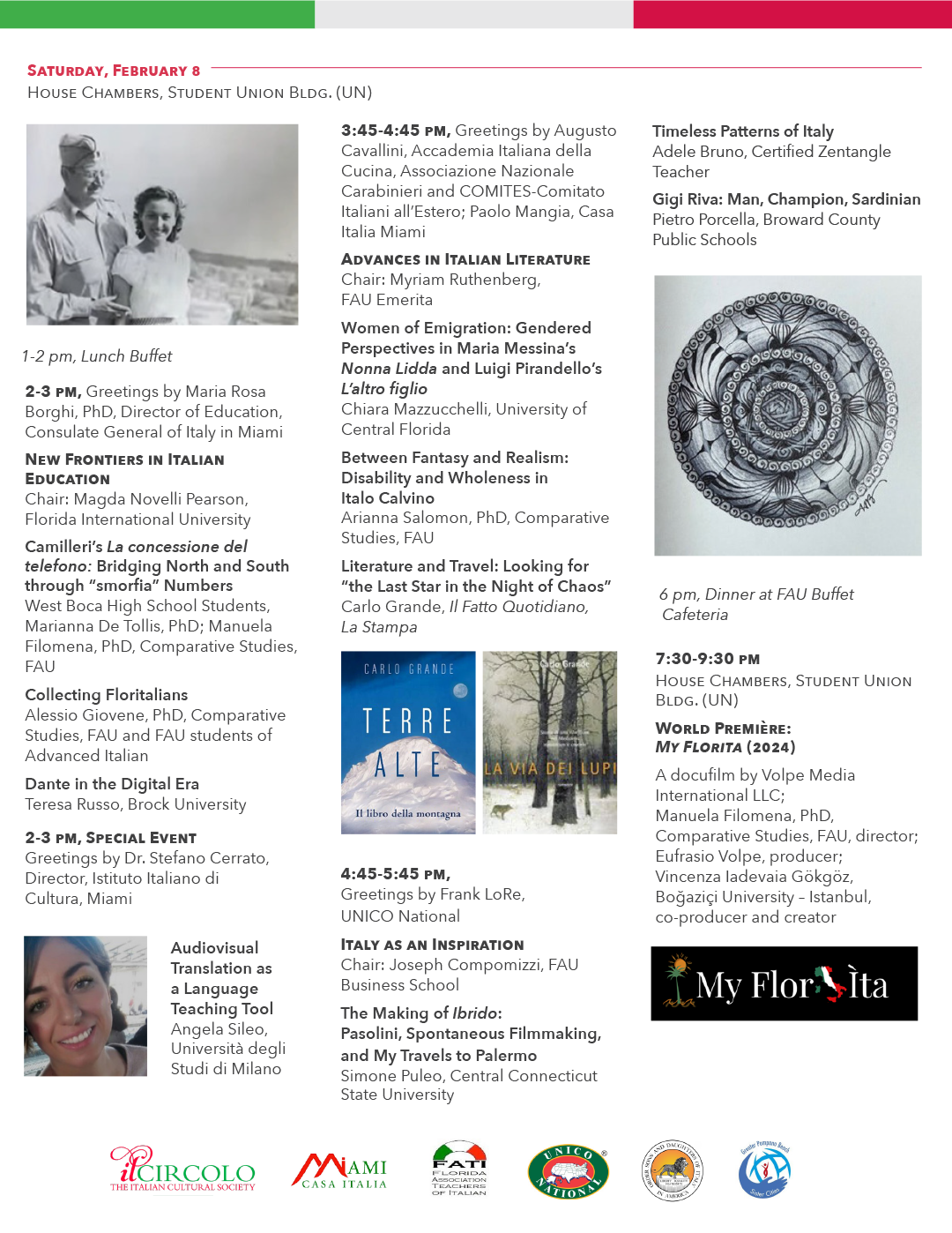 Organized by the FAU Italian Studies Program under the patronage of the Consulate General of Italy in Miami . Supported by the John D. Calandra Italian American Institute (New York), the FAU Initiative for the Study of the Americas, the Italian Cultural Institute in Miami, Sardinia Film Commission and European Union .