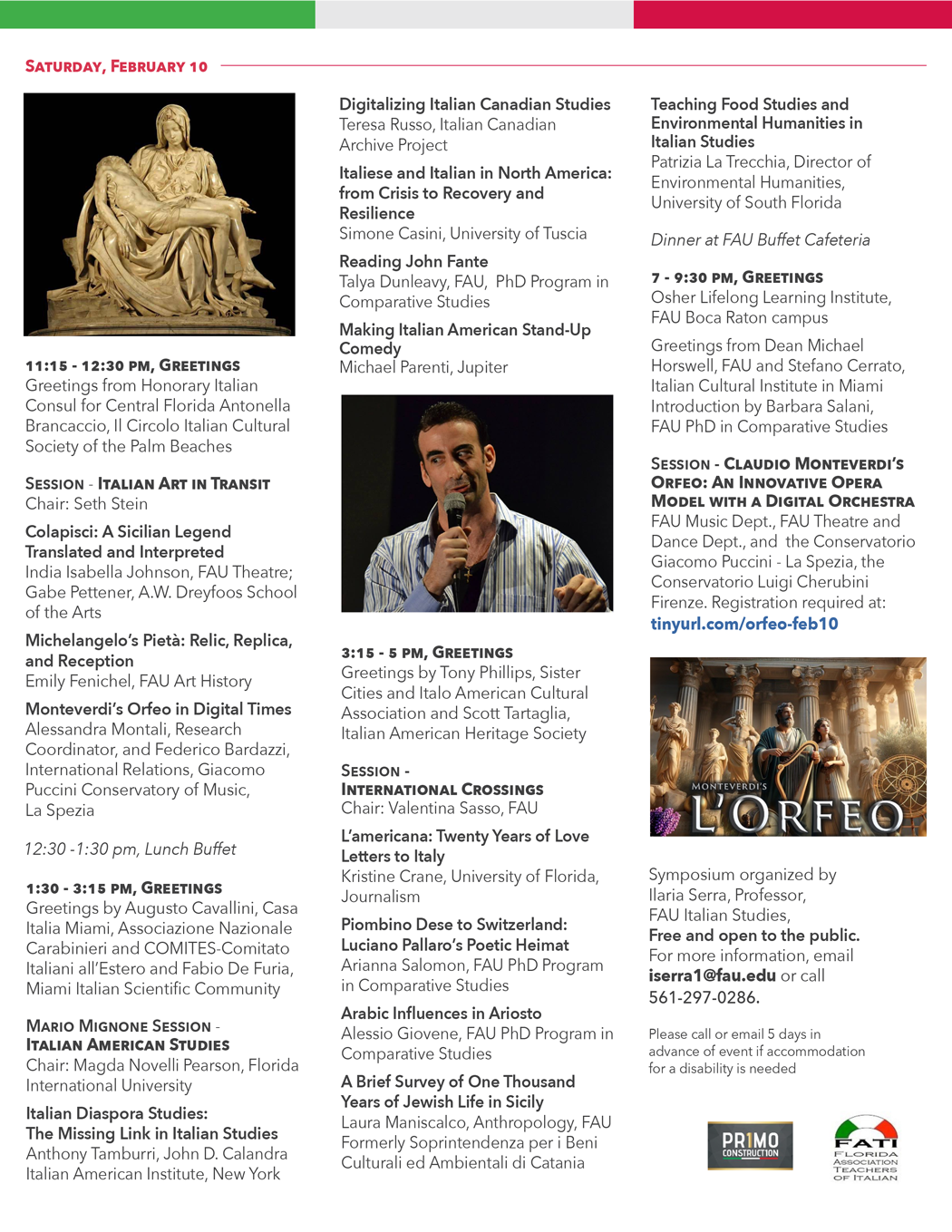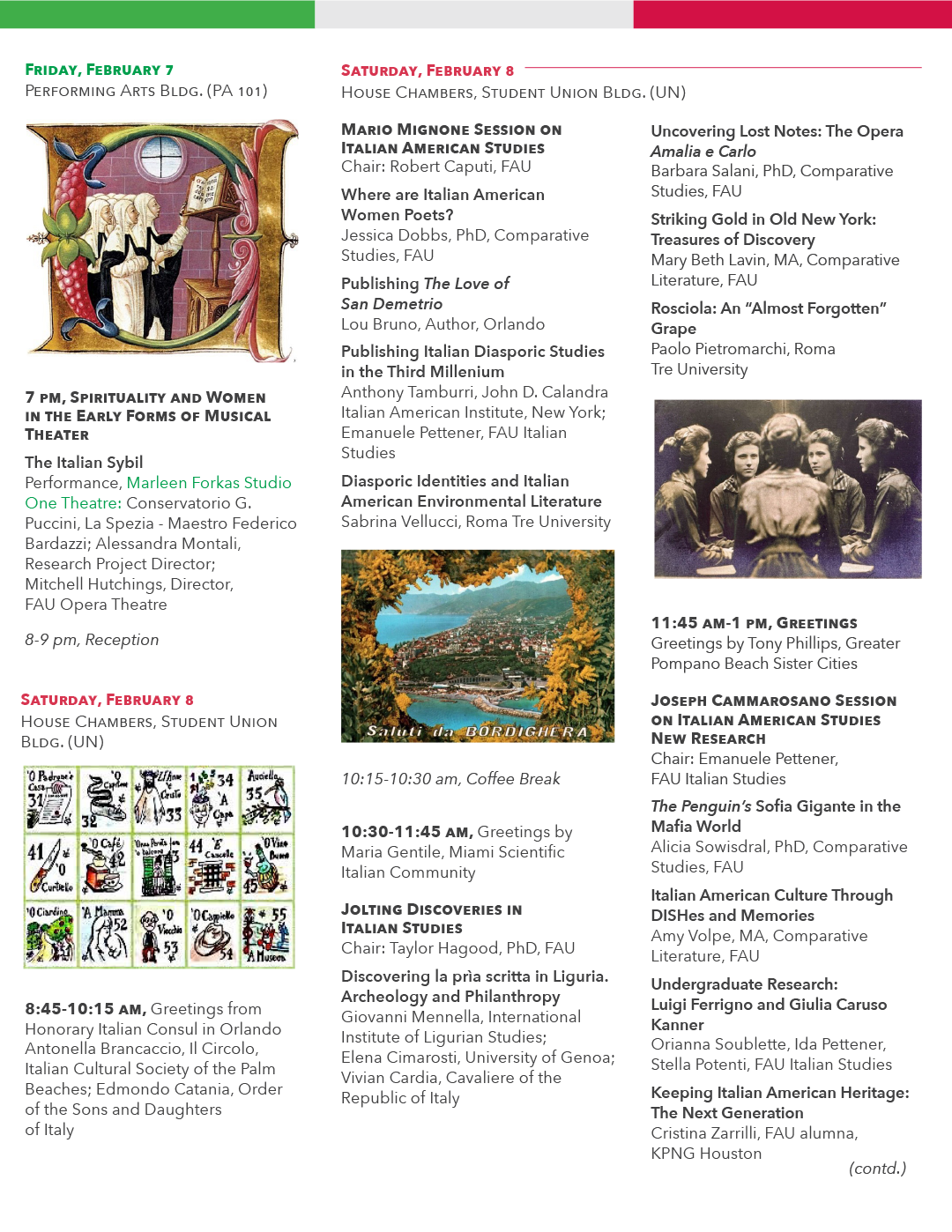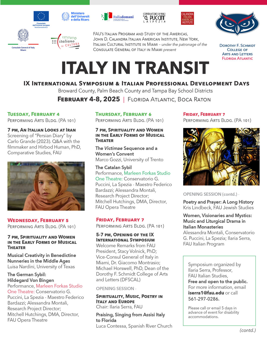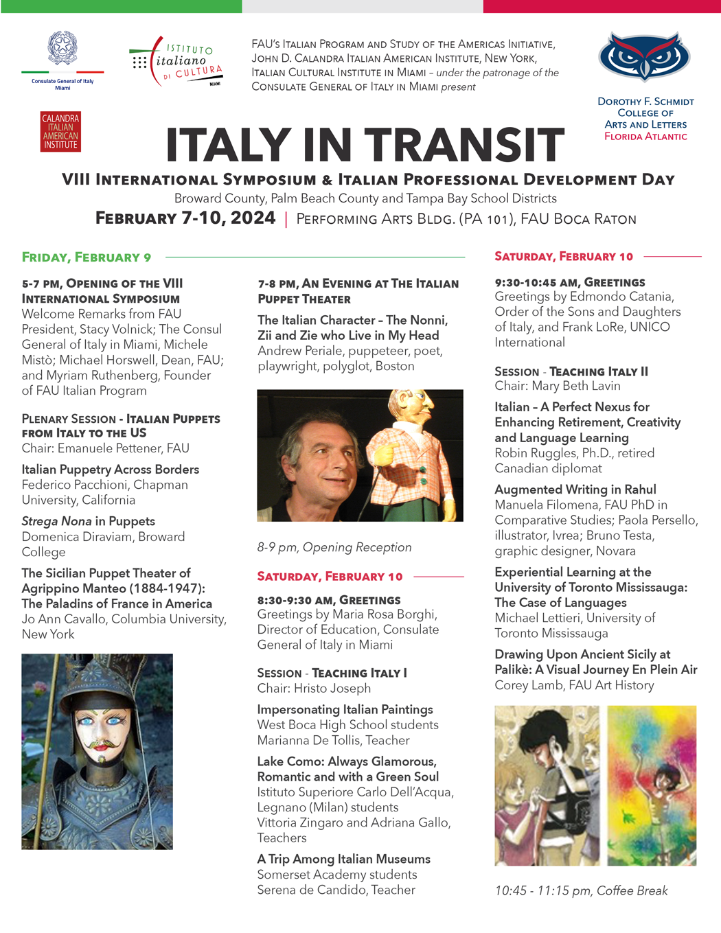 Organized by the FAU Italian Studies Program under the patronage of the Consulate General of Italy in Miami . Supported by the John D. Calandra Italian American Institute (New York), the FAU Initiative for the Study of the Americas, the Italian Cultural Institute in Miami, Sardinia Film Commission and European Union .