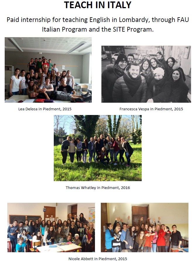 The FAU Italian Program has a collaboration with the High School Network of the Regions of Piedmont and Lombardy to hire American students as teachers of English as a Foreign Language.