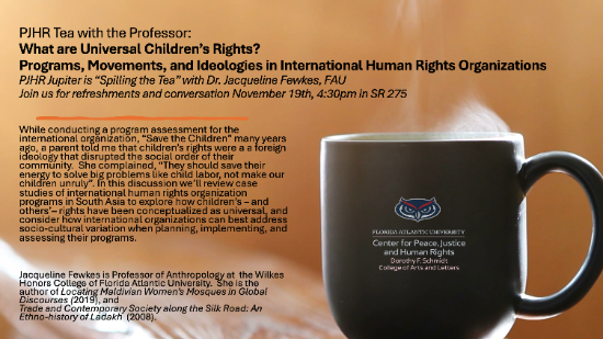 PJHR Tea with the Professor: What are Universal Children’s Rights? Programs, Movements, and Ideologies in International Human Rights Organizations Dr. Jacqueline Fewkes, FAU, November 19