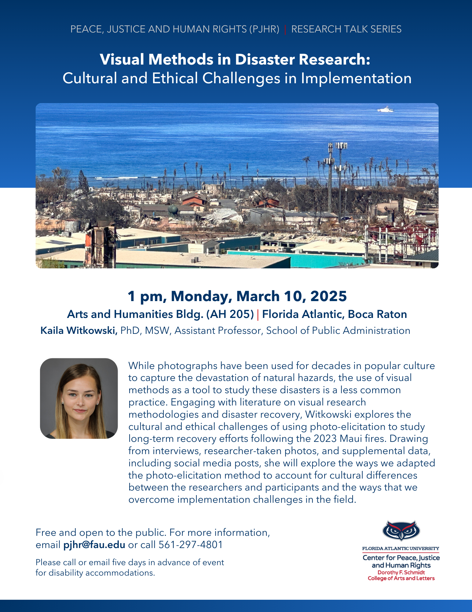 PJHR is excited to launch a new Research Talk Series , where FAU faculty and graduate students can present their research in an informal and engaging setting. Join us to learn, share ideas, ask questions, and engage in meaningful discussions. Light refreshments and small snacks will be served.