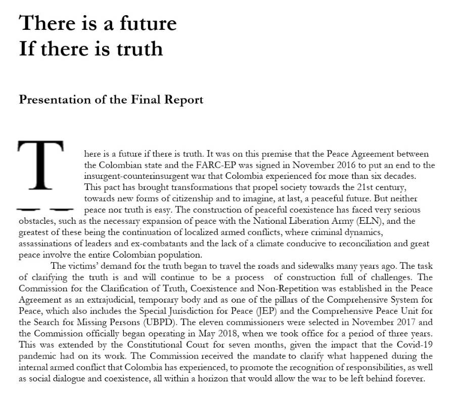 (Truth commission) released a series of extensive reports at the end of their three-year investigation into the human rights violations committed during the 52+ years of civil war in Colombia. A few summary documents from the commission have been translated into English.