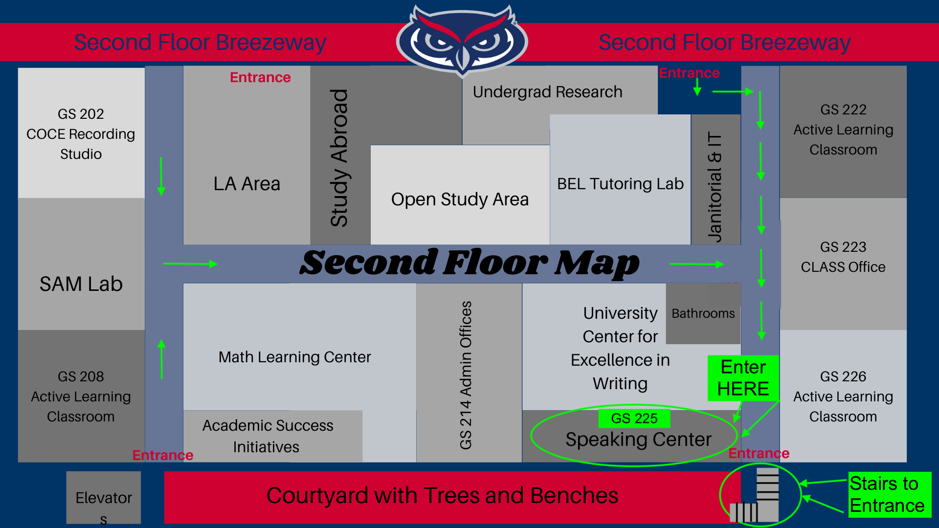 The Speaking Center is located within the Center for Teaching and Learning (CTL) on FAU's Boca Raton campus. For appointments, please enter through the main entrance of the CTL, located on the second floor of the breezeway between Starbucks and Chick-fil-A, and check-in with the front desk.