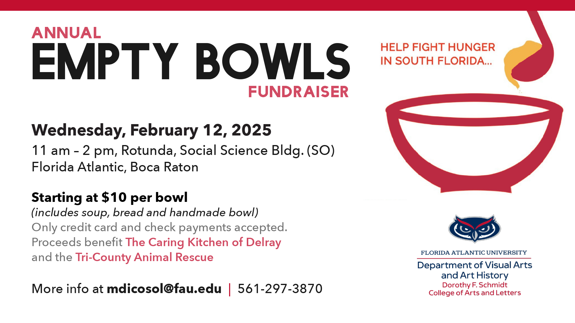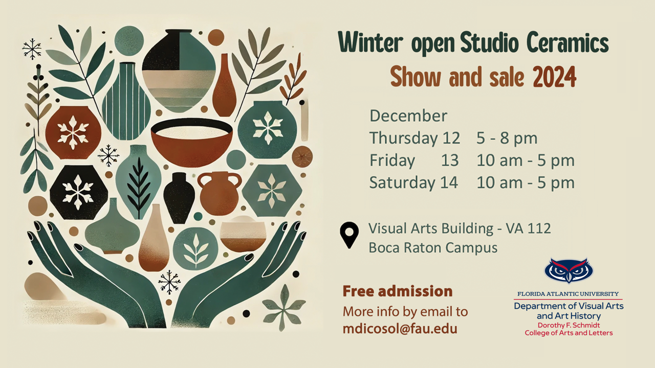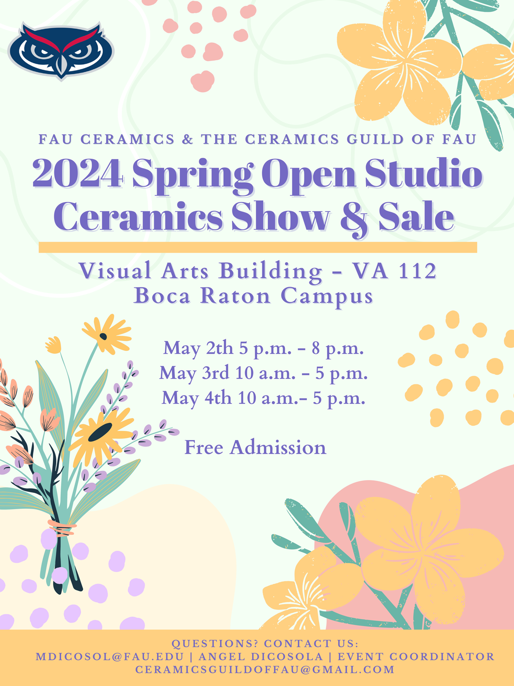 If you have any questions, please contact Angel DiCosola mdicosol@fau.edu or ceramicsguildoffau@gmail.com