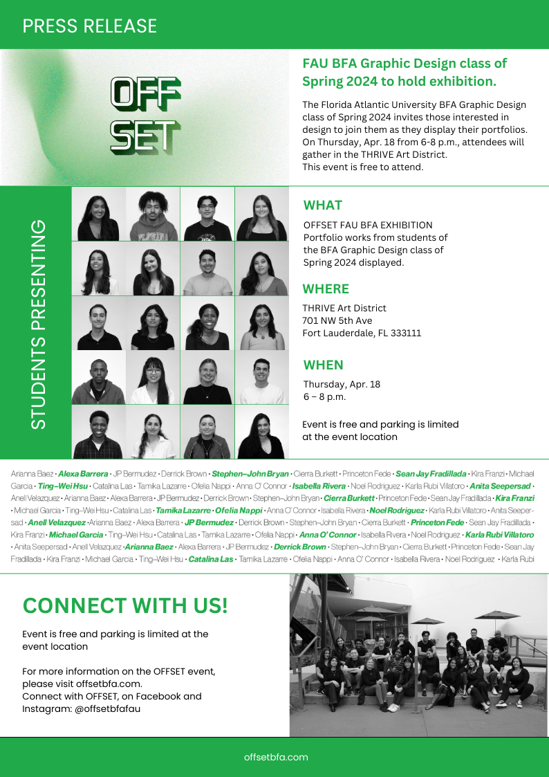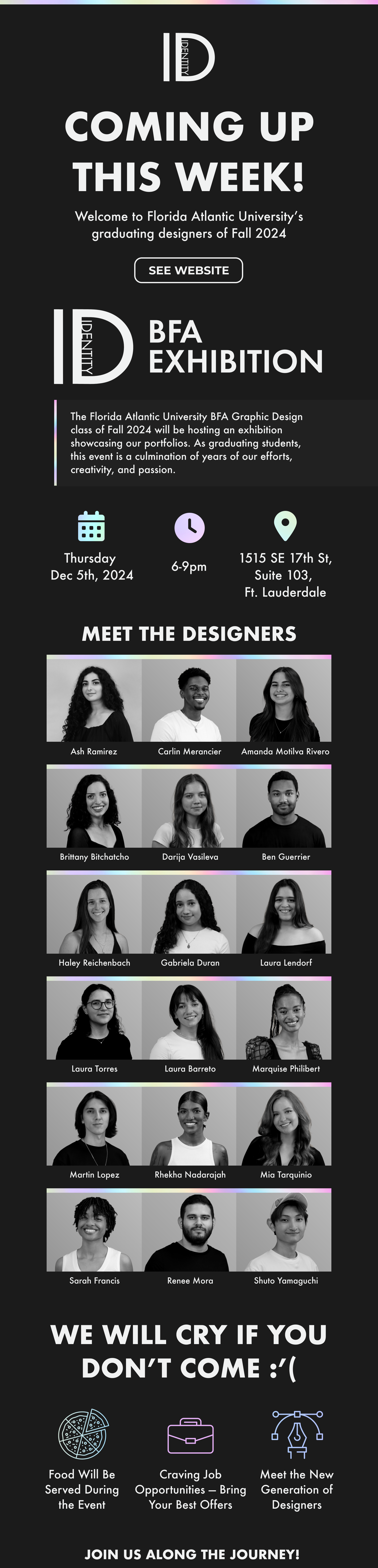 The Florida Atlantic University BFA Graphic Design class of spring 2024 invites those interested in design to join them at their Exhibition show.