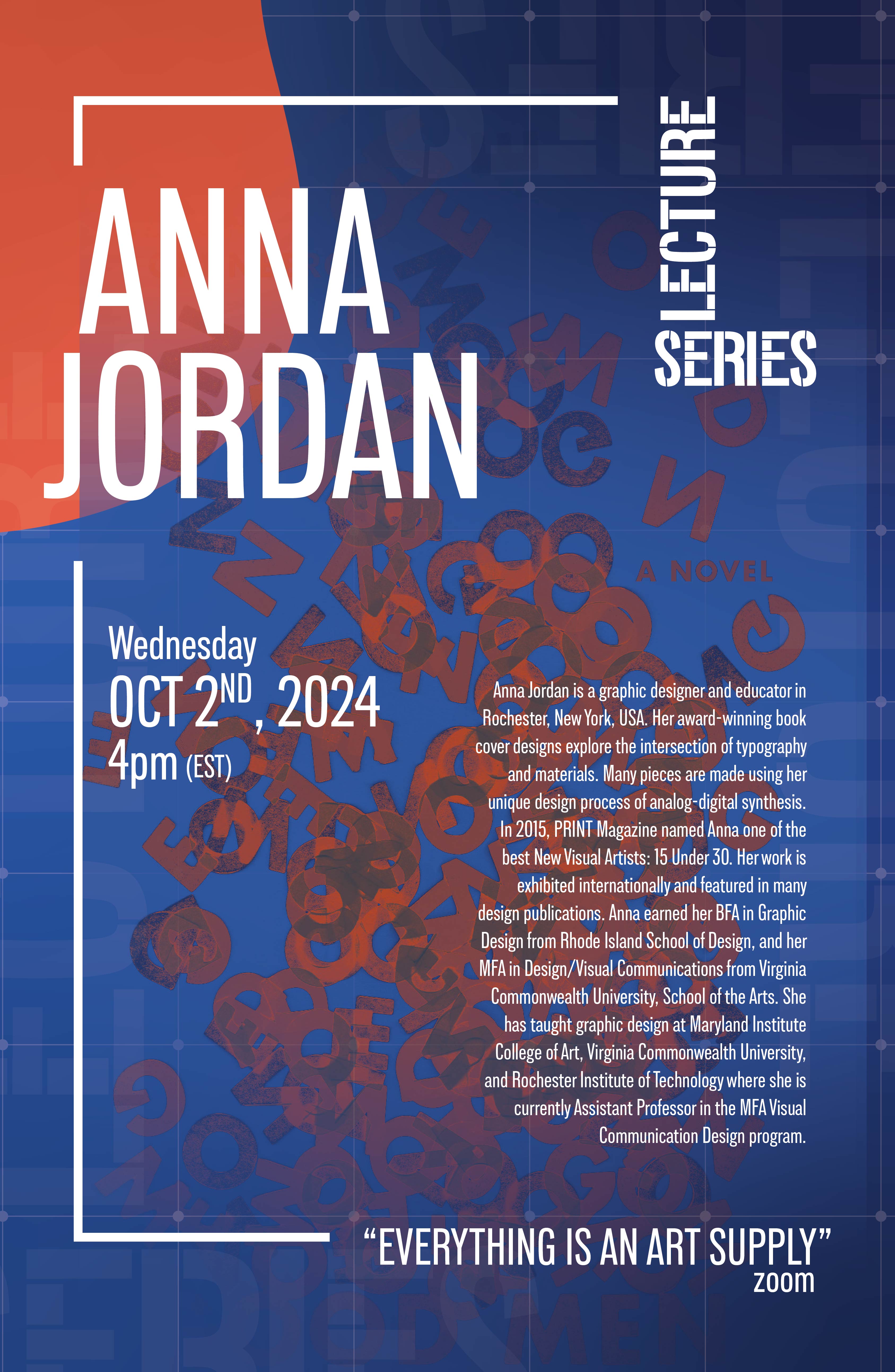 Anna Jordan is a graphic designer and educator in Rochester, New York, USA. Her award-winning book cover designs explore theintersection of typography and materials. Many pieces are made using her unique design process of analog-digital synthesis. In 2025, PRINT Magazine named Anna one of the best New Visual Artists: 15 Under 30. Her work is exhibited internationally and featured in many design publications. Anna earned her BFA in Graphic Design from Rhode Island School of the Arts. She has taught graphic design at Maryland Institute College of Art, Virginia Commonwealth University, and Rochester Institute of Technology where she is currently Assistant Professor in the MFA Visual Communication Design program.