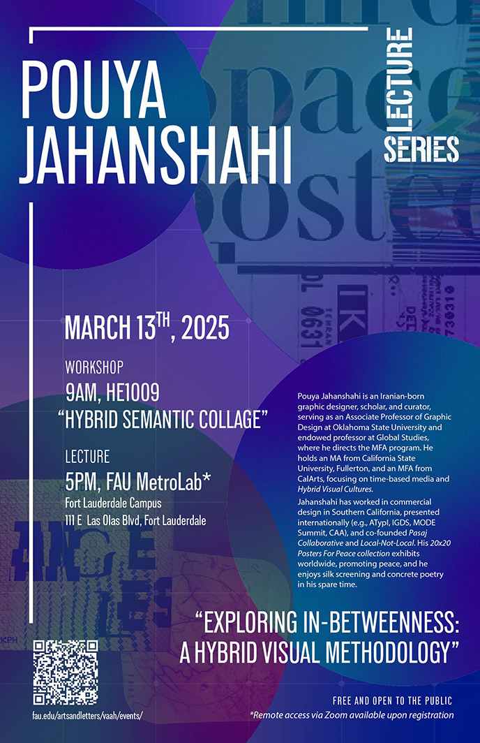 Pouya Jahanshahi is an Iranian-born graphic designer, scholar, and curator, currently an Associate Professor of Graphic Design at Oklahoma State University, an endowed professor at the Global Studies, and the director of the MFA program. He earned his MA in Graphic Design at California State University of Fullerton (CSUF), focusing on the Anatomy of a Visual Message and semiotics of time-based media. As an Art Director, he engaged in the commercial sphere of design and advertising in Southern California. Returning to academia, he earned his MFA in Graphic Design and Integrated Media from the California Institute of the Arts (CalArts). His research inquired about the global development of what he has termed Hybrid Visual Cultures. He has presented on such related issues internationally in venues including ATypI (Association Typographique Internationale’), IGDS (Iranian Graphic Design Society), and MODE Summit (Motion In Design Education), and College Arts Association (CAA), amongst others. He is the co-founder of Pasaj Collaborative and Local-Not-Local art and design collaboratives. As a Design Activist, his curated 20x20 Posters For Peace collection is now being exhibited across the globe, disseminating the message of peace. While working with a broad range of cultural organizations and clientele, he pursues his silk screening and concrete poetry hobbies – when time permits.