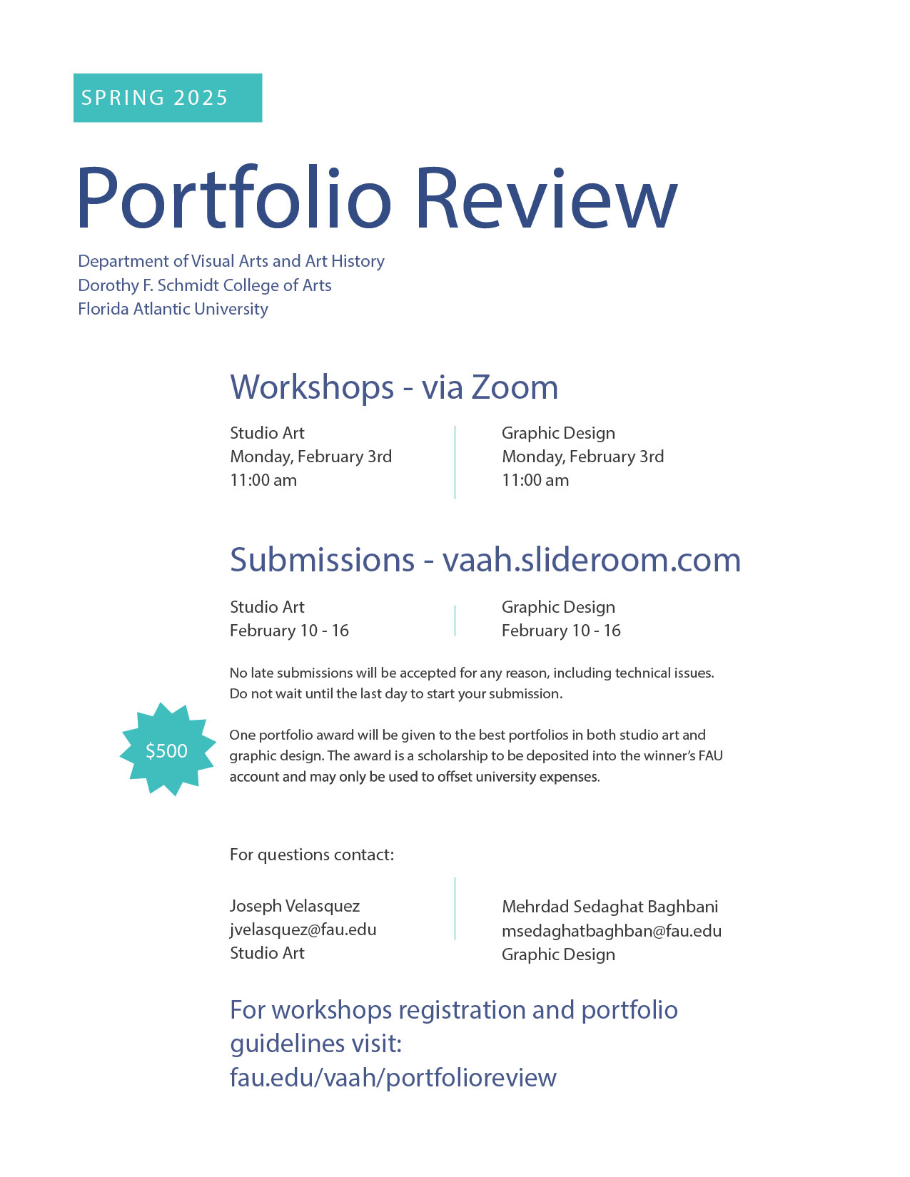 One $500 portfolio award will be given to the best portfolios in each category. The award is a scholarship to be deposited into the winner's FAU account and may only be used to offset university expenses.