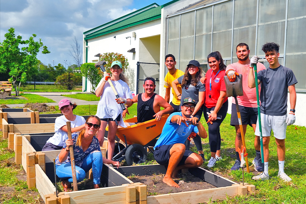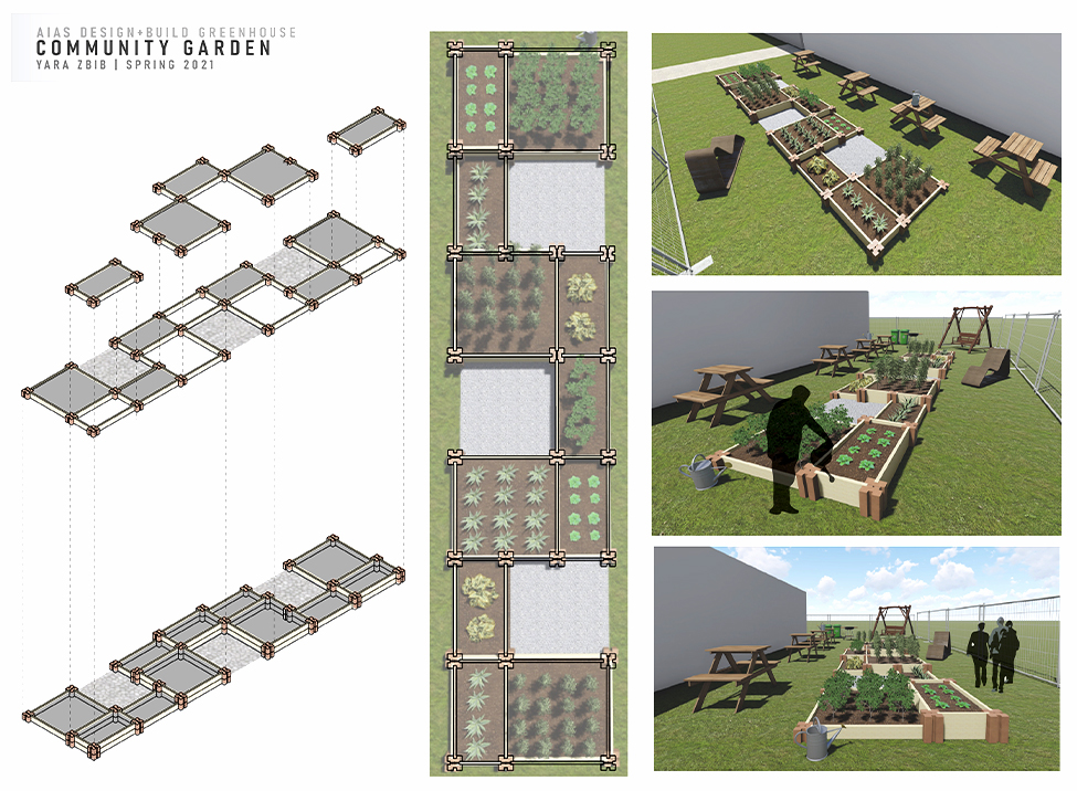 Among the students attending the SAVI events were Yara Zbib and Jonathan Gloria. Both developed a fondness for the aging structure and began to see its greater potential. Encouraged by Campus Life, Zbib rallied the FAU chapter of the American Institute of Architecture Students (AIAS), for which she served as president in 2020-21. AIAS conceived of the Design+Build Project, an opportunity to "get involved in the community through design," according to Zbib. "Our goal was to add community garden space on the Davie campus to encourage students to grow their own fruits and vegetables." AIAS accomplished their goal on May 22 when ten members installed a uniquely designed raised-bed garden in front of the greenhouse.