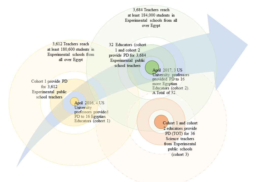 The partnership began with a commitment to provide professional development for 10,000 public school teachers predicated on the belief that education is a lever for opportunity. The FAU team rallied behind a vision to improve student learning by building teacher capacity using a teacher-of-teacher model. FAU faculty created a curriculum for a professional development program to prepare teacher leaders from private international schools, who in turn then became the PD facilitators for two cohorts of teachers in experimental public schools across Egypt. Teachers in experimental public schools were targeted as a first step because these schools were perceived as possible vehicles for quality education to advance social mobility opportunities for lower middle class families in Egypt.