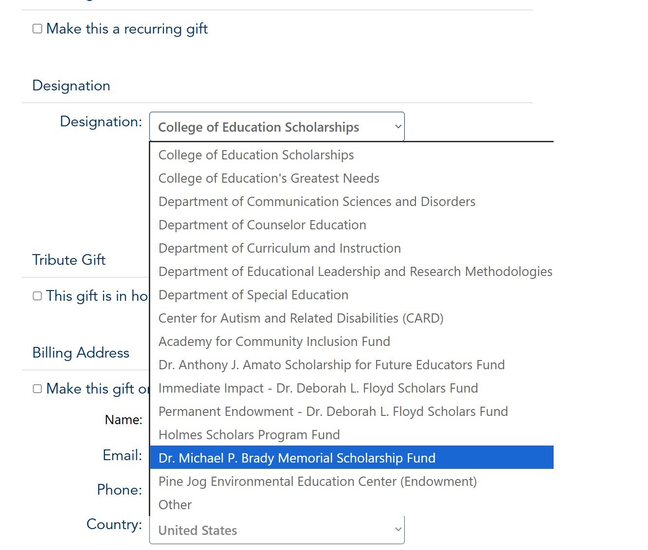 Please select the "Dr. Michael P Brady Memorial Scholarship Fund" from the list of Designations.