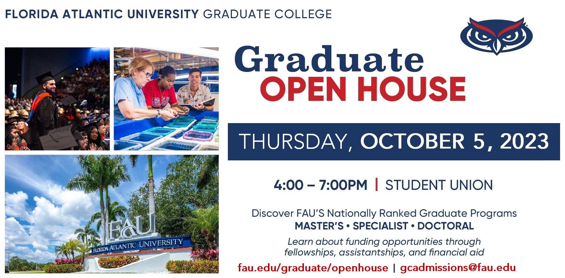The Florida Atlantic Graduate College is hosting its annual Open House on Wednesday, October 8, 2025 from 4:00 - 7:00 p.m. at the Florida Atlantic University Boca Raton Campus, Student Union. This event will feature graduate program representative from all academic colleges. There will also be a special information presentation for FAU high school students and their families. All attendees will have the opportunity to: