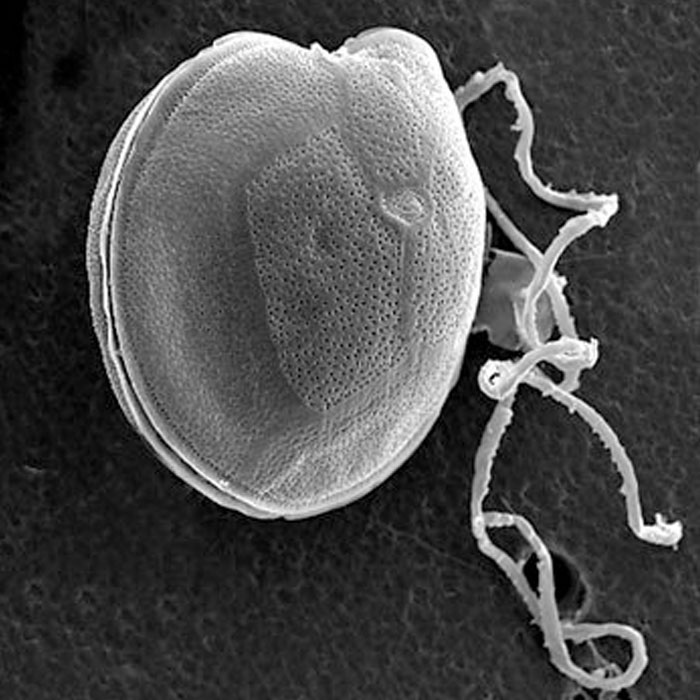 Also known as “red-tide”, this dinoflagellate blooms annually in the Gulf of Mexico, usually during late summer or early fall, and widely impacts the west coast of Florida. Under rare circumstances, currents can transport these blooms south, and around the tip of Florida where they can then impact the east coast. Karenia brevis produces brevetoxin, a neurotoxin that can cause neurologic shellfish poisoning if consumed, or more commonly, asthma-like symptoms if inhaled.
