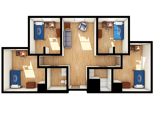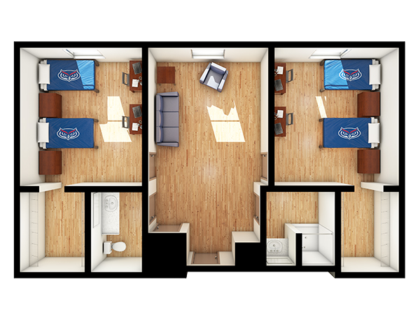 Indian River Towers (IRT) a suite-style residence hall consisting of both double and single rooms for first time in college students. All suites feature a living area, one bathroom and two vanity facilities.