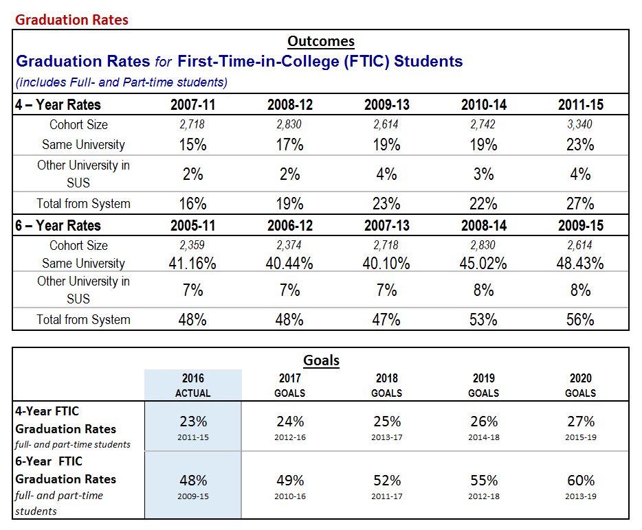 In accordance with the State University System of Florida Board of Governors, FAU reports outcomes for student achievement each year in the FAU Accountability Report and updates goals for student achievement each year in the FAU Work Plan |