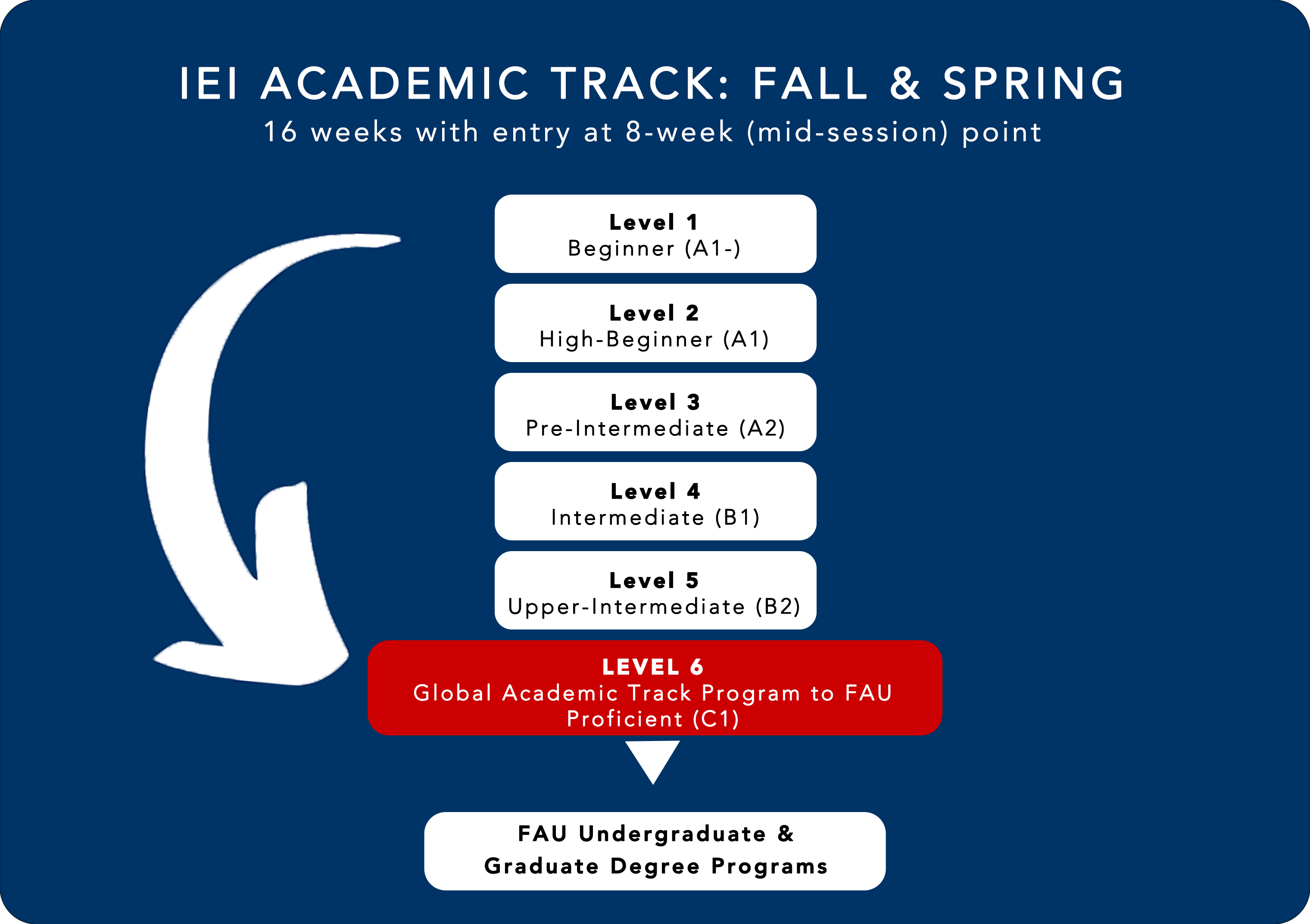 - Successful completion of Level 6 provides entrance to the IEI’s prestigious Global Academic Track Program to FAU degree courses. See sample schedule below.