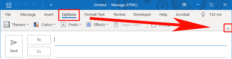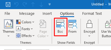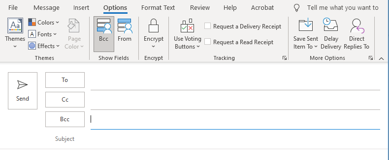- A new message window appears. Click the Options tab, then click the Bcc icon from the ribbon
