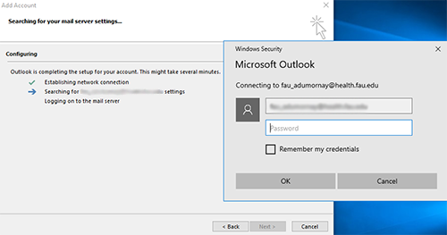 - When opening Outlook for the first time on the network, Outlook will automatically open with a FAU login prompt.