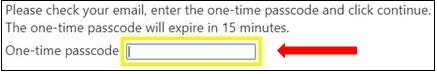 - After clicking on the one-time passcode option, another browser window will replace the previous window in step 2. This window will tell you that an email has been sent to your email address and will be asking for the one-time passcode.