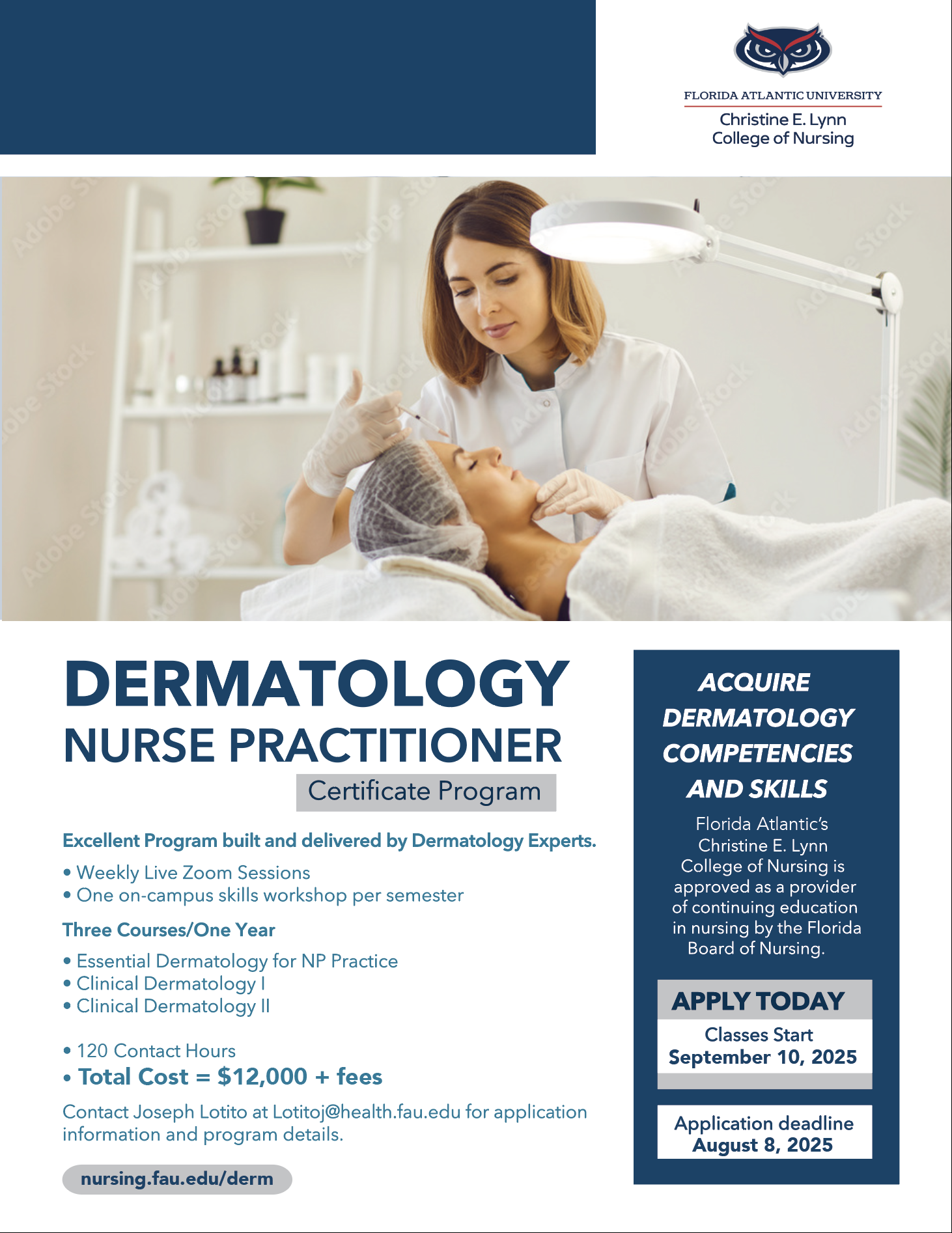 The Florida Atlantic University (FAU) Dermatology Nurse Practitioner (NP) Certificate Program prepares NPs with the knowledge and skills for specialization in general dermatology to care for patients across the life span. Master’s and doctoral prepared NPs will acquire foundational core competencies in their population-focus areas. Most often, NP educational preparation includes little dermatology education and training. Therefore, NPs who wish to specialize in dermatology are left to develop competencies through on-the-job training or in a rare fellowship program.