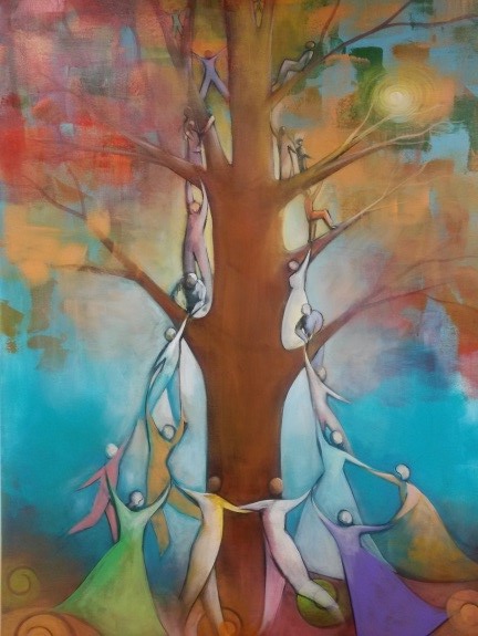 Broadway has a very real gift of healing through his art. In the painting, the tree represents a safe place, where all help in the process of healing. Scholarship is represented by the trunk. The figures are all connected one to another and to the tree, secure amid the storms of life. Healing occurs as they climb higher and higher amid the branches of the tree. Sunlight streams through the branches, illuminating the spiritual aspect that comes from creation.