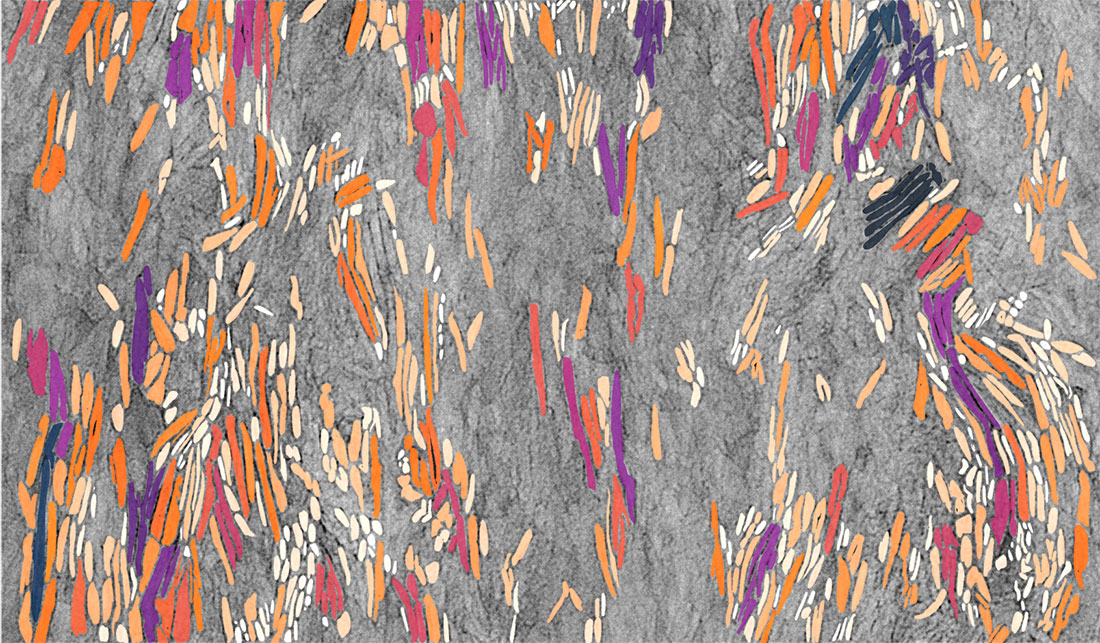 This Time It's Mineral: As sharks swim, their cartilaginous vertebral column bends and deforms, much like a spring — absorbing and releasing energy. Shark vertebrae are particularly interesting due to the interplay between mineralized (hard) and unmineralized (soft) cartilage. Since the structure and properties of biomaterials at the nanoscale influence their response to stresses, we investigate the arrangement of biominerals within fibers of shark vertebral cartilage. From this, we can gain insight into how the interaction between biomineral and collagenous material at the microscopic scale influences bulk material properties and the macroscale swimming efficacy of sharks. Here, we look at mineralization patterns in the vertebral cartilage of blacktip sharks (Carcarhinus limbatus). Mineralized blocks from 1-inch diameter vertebrae were prepared into 70-nanometer slices and imaged using FAU’s Jeol 1400 flash transmission electron microscope. Image colorized to emphasize the amount, shape, size, and orientation of nanocrystalline apatite mineral within the collagen network. Image width: 70μm