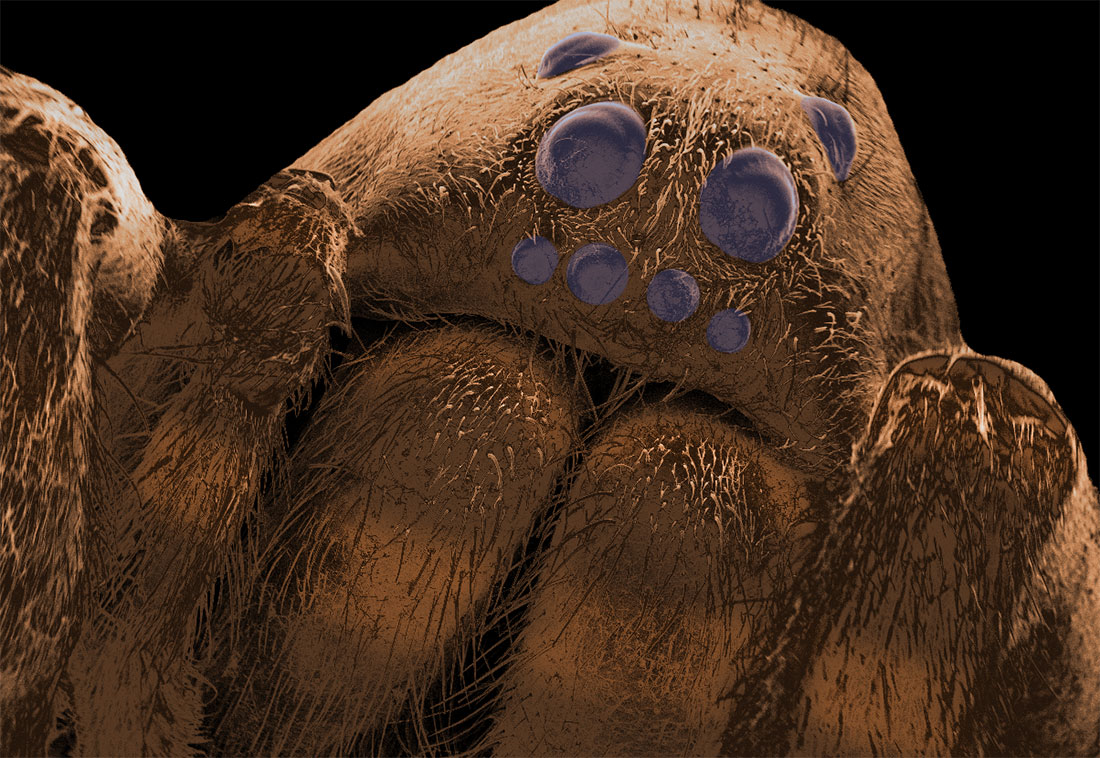 False-colored scanning electron microscope (SEM) image of a spider. SEM imaging uses a beam of electrons to visualize specimens and can be difficult to capture images when using biological specimens that are wet and non-conductive. Traditional preparation methods include critical point drying which can damage fragile specimens like insects and arachnids. A solution (literally a solution) to this is NanoSuit, a thin layer added to the SEM specimen prior to imaging. This technology is conductive and conceals the moisture in a vacuum environment to permit imaging of specimens without drying and sputter coating. The NanoSuit solution was applied to this spider and imaged using a JEOL Neoscope 6000 Plus SEM.