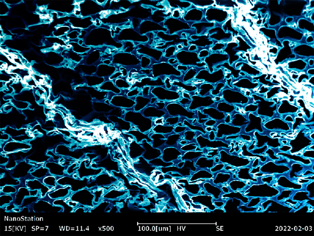 A microscale image of the surface of a hybrid material synthesized in the lab. Using wood as the vessel, iron oxide particles were synthesized in situ inside the cell wall. The image was taken using scanning electron microscopy, which uses a focused beam of electrons to scan the surface of the sample for data collection. This hybrid material is synthesized for pollutant remediation. Iron oxides are known to absorb pollutants in water bodies, such as our contaminant of focus, arsenic. Inserting these particles into an organic scaffold immobilizes the iron oxides, ensuring they do not leach out into the environment it was created to clean up.