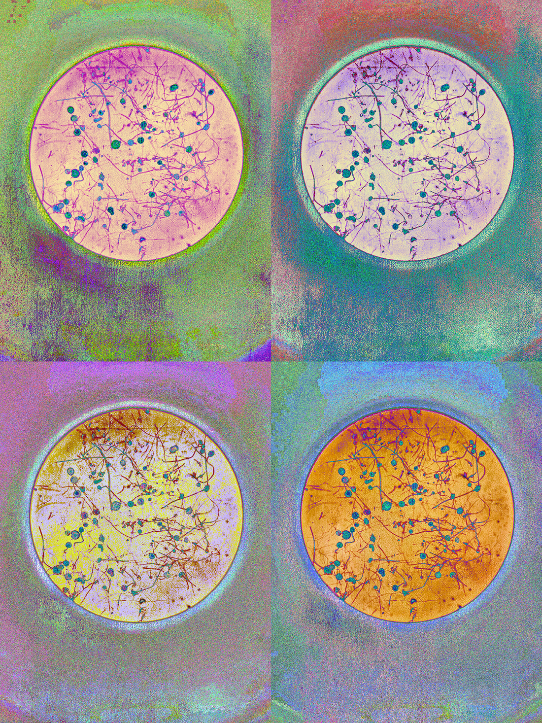 This image offers a close-up view of a Rhizopus sporangia, a pivotal fungal reproductive structure commonly found in diverse ecosystems. Captured in my biodiversity lab, the photograph showcases the vibrant colors that accentuate the sporangia's intricate details, which often go unnoticed by the naked eye. To add a touch of artistry, a subtle grainy filter was applied, emphasizing the microscopic linework within the image. Additionally, enhanced saturation was used to create a sharper and more vivid representation. With four color variants, this image not only celebrates the captivating beauty of this microscopic world but also underscores the diversity inherent in the natural sciences.