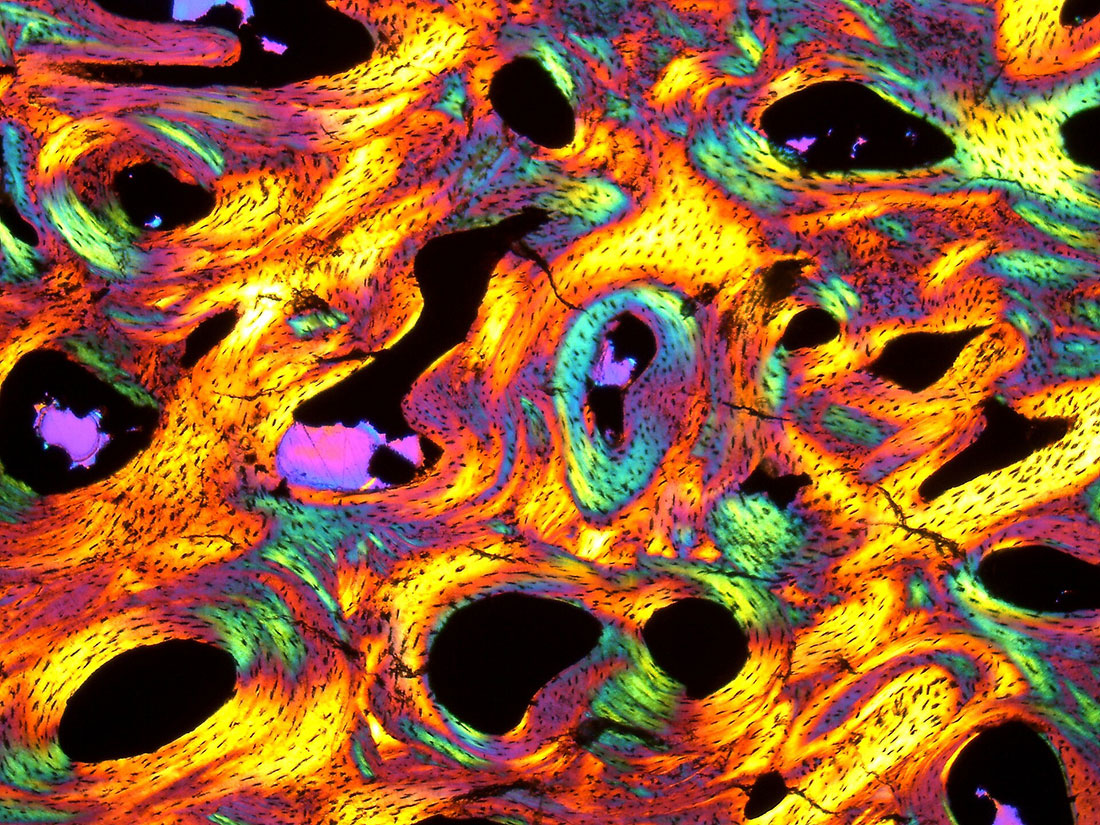 This is an image of an approximately 30-micrometer thick slice of rock — bone in that case — attached to a glass slide with epoxy, which is a widespread method of studying rocks and fossils. Pictured is a section of a leg bone, which is peripheral, closer to the edge of the bone and both contain different, denser bone tissue, and is somewhat altered by erosion. Portions of the slide have visible haversian canals, which are minute tubes inside a bone and contain blood vessels from a specimen of the Triceratops horridus Marsch, 1889, found in North Dakota. Remains of the triceratops are located at the site that represents a deposit of seismically induced waves from the giant asteroid that struck the Earth 65 million years ago. Although the triceratops probably died shortly before the impact, it is probably one of the last dinosaurs that ever walked in North America. More details about the research on the Tanis site in North Dakota can be found here: https://www.ncbi.nlm.nih.gov/pmc/articles/PMC6486721/