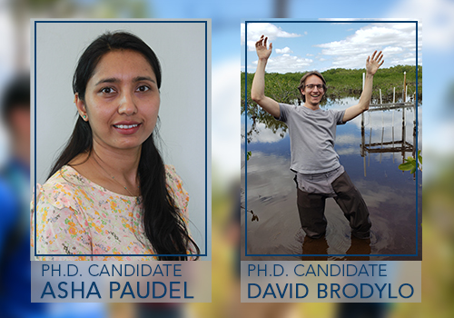Two FAU Charles E. Schmidt College of Science students were winners in the 58th annual Florida Society of Geographers Awards. Department of Geosciences Ph.D. candidates Asha Paudel won the “Outstanding Oral Presenter, Ph.D.” award, and David Brodylo received the “Outstanding Poster Presenter, Ph.D.” award.