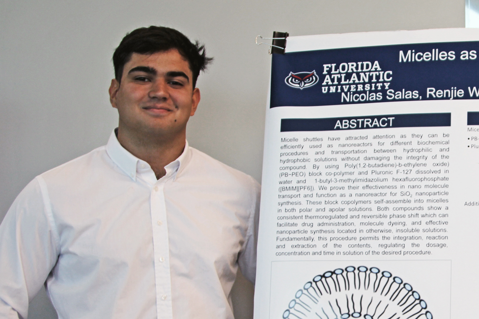 Junior Nicolás Salas, a Neuroscience and Behavior major, aims to find a mechanism to facilitate the transport of chemical sensors through hydrophobic and hydrophilic solutions. If he discovers a method, it could facilitate drug administration and possibly reuptake or recycle drugs. He is working with faculty mentor, Renjie Wang, Ph.D., assistant professor of chemistry and biochemistry, on the project titled, “Micelles as a thermoreversible transport for chemical sensors.”