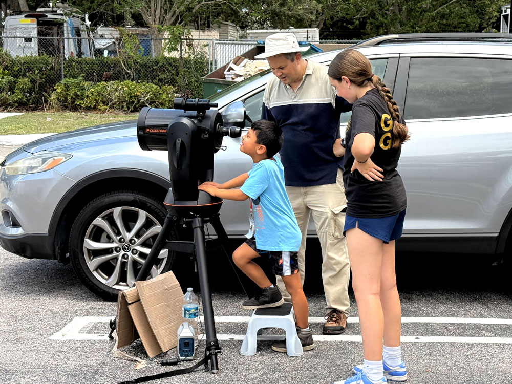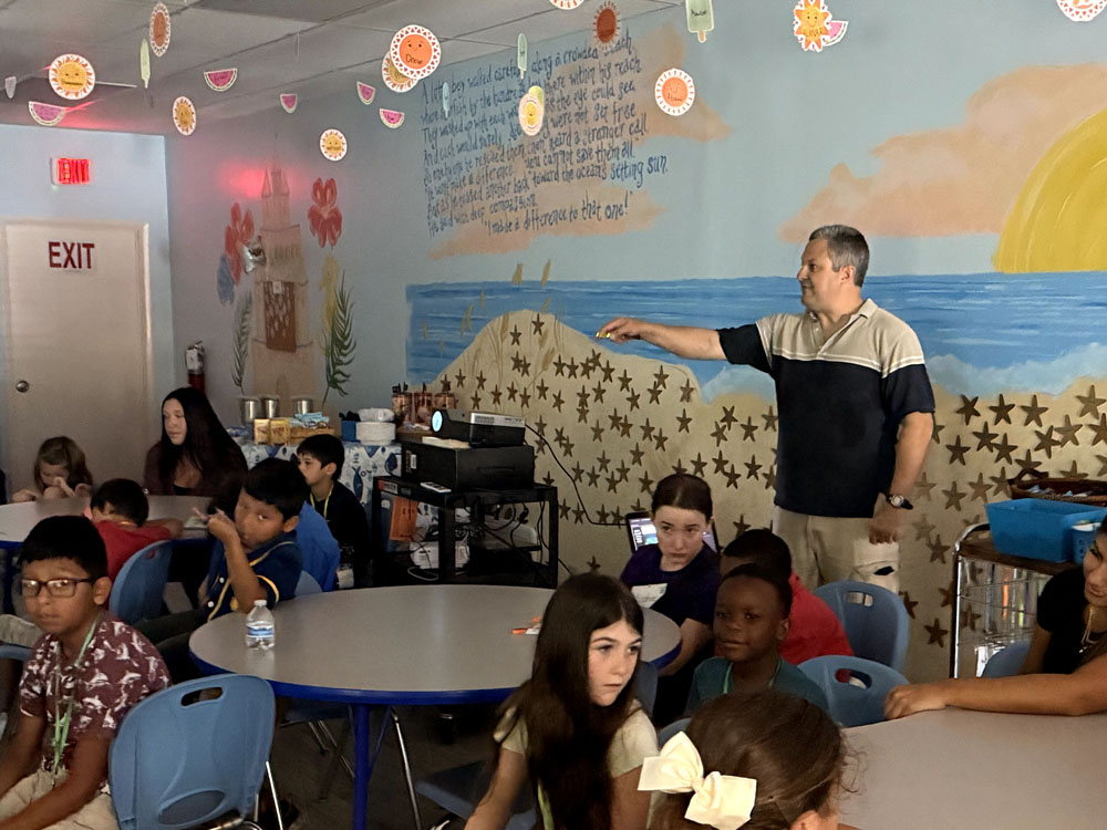 Astronomy and Physics Lab Coordinator, and Observatory Manager, Eric Vandernoot shared his celestial knowledge for a full day of fun with campers at the Kids Cancer Foundation Summer Camp on June 24 in Royal Palm Beach. More than 30 children enjoyed learning about one incredible star, the Sun. In the afternoon, Vandernoot set up a powerful solar telescope outside for campers to safely observe the Sun using solar filters to see sunspots up close but switched to terrestrial viewing when the clouds came out.