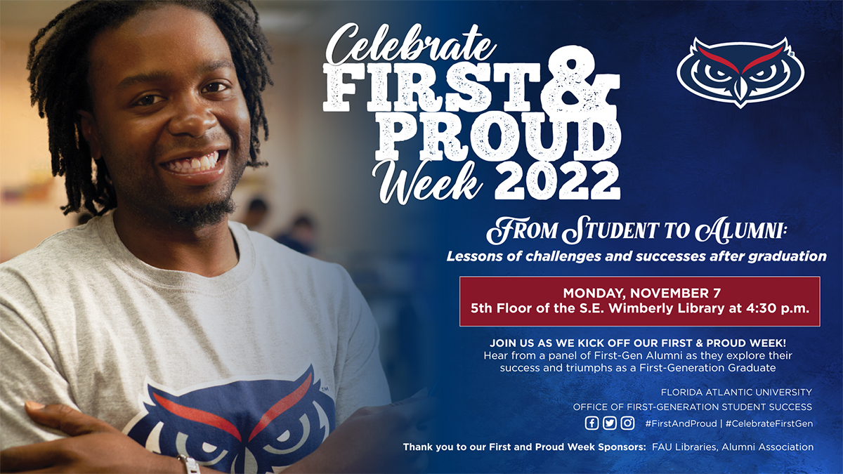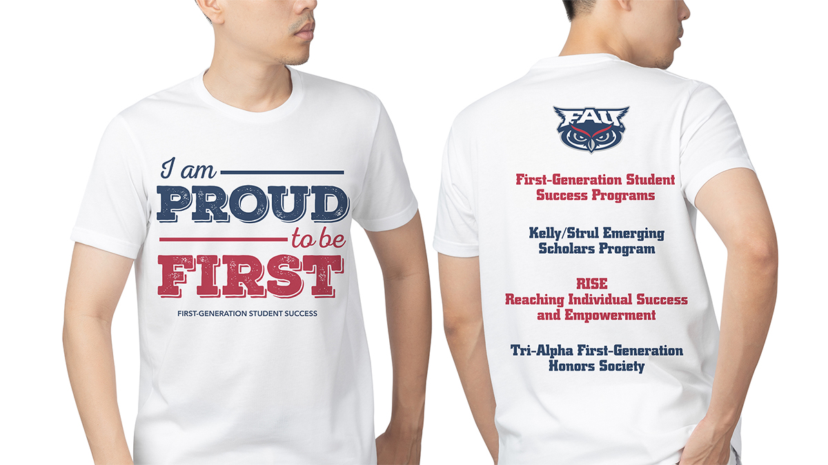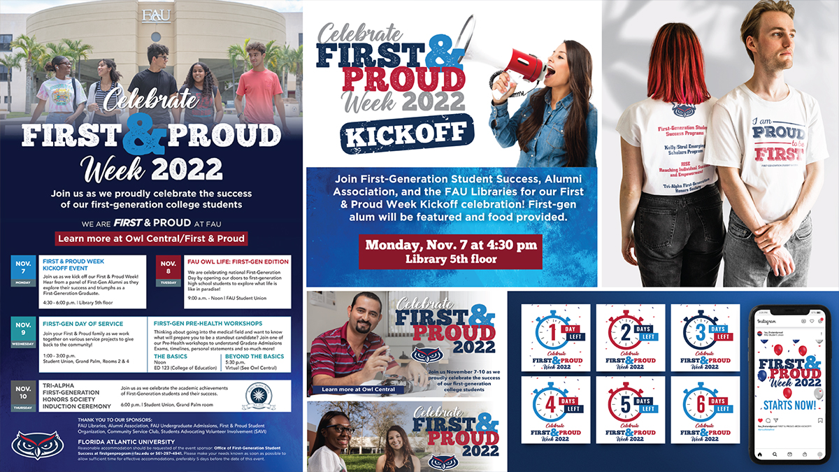 Celebrating the success and development of our first-generation college students, the Marketing and Communications team created a campaign for First & Proud Week 2022. Materials included flyers, a social media countdown, t-shirts, and more.