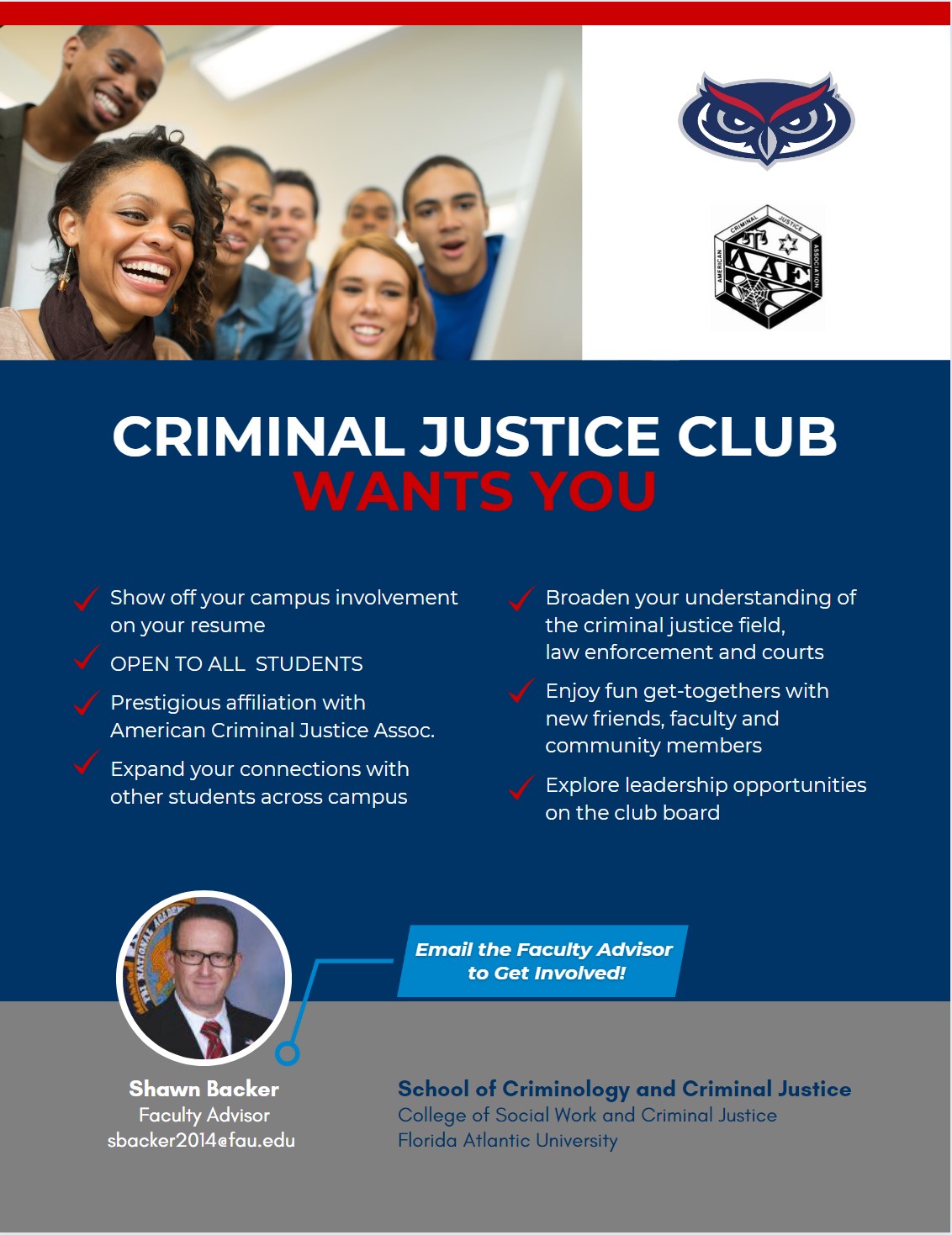 Led by Shawn Backer, the Club is open to all students at Florida Atlantic University and partners well with majors in Criminal Justice, Public Policy, Social Work and many others. If you are interested in joining, view the club flyer and email the faculty advisor, Shawn Backer, to get started.