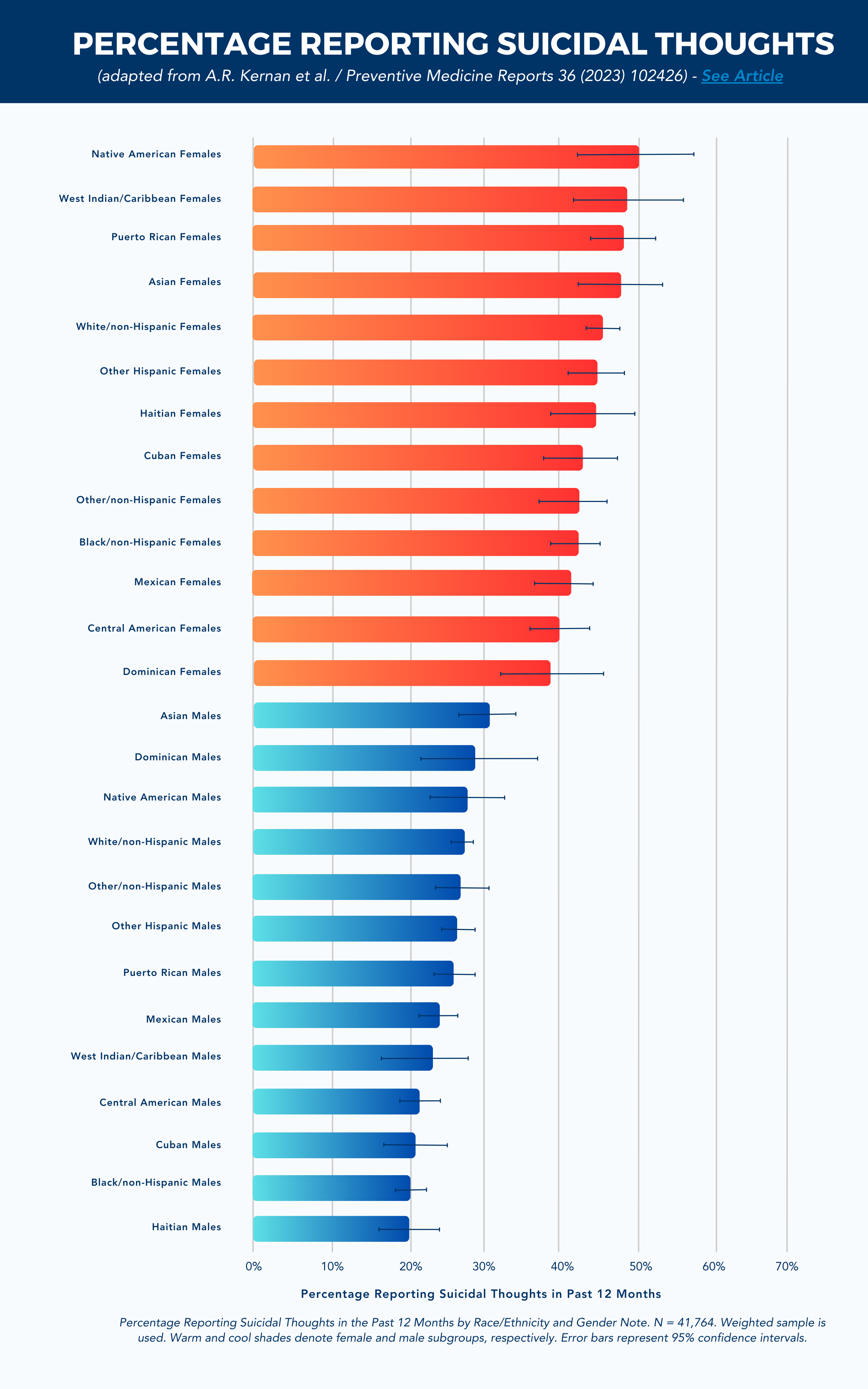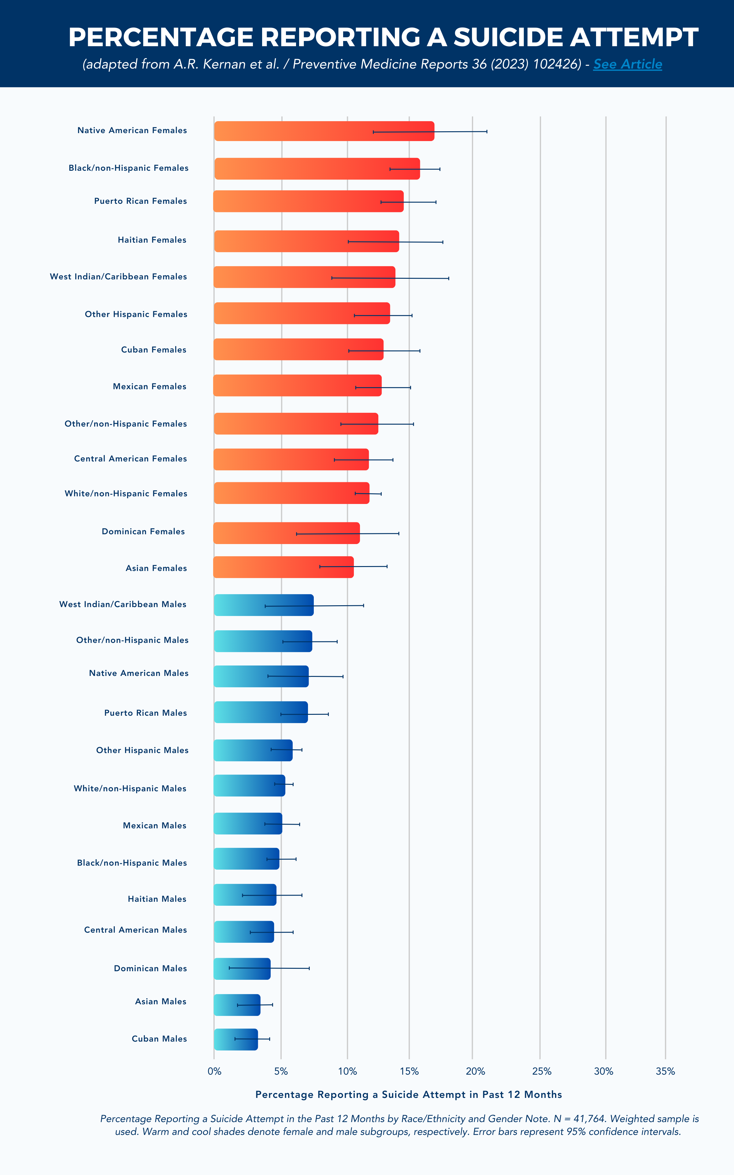 The findings of the study revealed higher rates of suicidality for females, particularly among Native American females. 34% of all youth surveyed reported suicidal thoughts within the past year, but among Native American girls it was 50%. Likewise, while 9% of all youth reported a suicide attempt, this statistic was nearly 17% among Native American girls. Other racial/ethnic groups of girls that reported particularly high rates of suicidal thoughts and attempts were West Indian/Caribbeans, Puerto Ricans, and non-Hispanic Blacks.