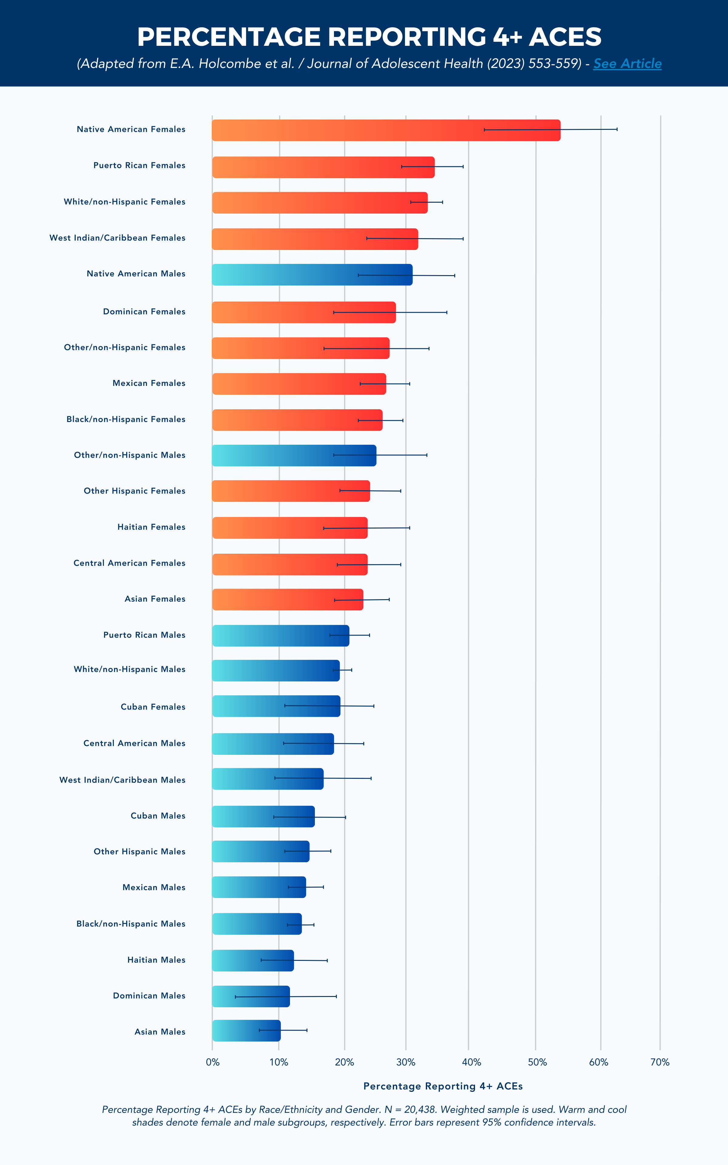 Of note, an inventory tapping Adverse childhood experiences (ACEs), focusing on different aspects of abuse, neglect, and household dysfunction, was added to the high school version of the FYSAS in 2020. A related study using this inventory by Dr. Meldrum and co-authors from Sam Houston State University and Brigham Young University published in the Journal of Adolescent Health earlier this year examined which groups of youth report the greatest exposure to ACEs. Not unlike the study focused on suicidality, the data once again showed female youth and Native American girls in particular report significantly elevated exposure to a high number of ACEs.